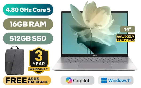 ASUS Vivobook S14 S3407VA Intel® Core™ 5-210H up to 4.80GHz Processor, 12MB Cache, 8x Cores, 12x Threads / 16GB DDR5 RAM / 512GB Ultra-Fast NVMe SSD / 14" WUXGA (1920 x 1200) Anti-Glare IPS-Level Display / Integrated Intel® Graphics / Windows 11 Home (64bit) / Realtek Wi-Fi 6 8852BE Wireless LAN / Bluetooth 5.3 / 1080p FHD IR camera With privacy shutter / 2x USB Type-A / 2x USB Type-C (Supports for Display / Power Delivery) / 1 x HDMI / 1x Microphone and Headphone Combo jack / White Backlit Chicklet Keyboard / 2x 2W Integrated Speakers / FREE Asus Backpack / ASUS Vivobook S14 S3407VA Core 5 Laptop DealASUS Vivobook S14 S3407VA Intel® Core™ 5-210H up to 4.80GHz Processor, 12MB Cache, 8x Cores, 12x Threads / 16GB DDR5 RAM / 512GB Ultra-Fast NVMe SSD / 14" WUXGA (1920 x 1200) Anti-Glare IPS-Level Display / Integrated Intel® Graphics / Windows 11 Home (64bit) / Realtek Wi-Fi 6 8852BE Wireless LAN / Bluetooth 5.3 / 1080p FHD IR camera With privacy shutter / 2x USB Type-A / 2x USB Type-C (Supports for Display / Power Delivery) / 1 x HDMI / 1x Microphone and Headphone Combo jack / White Backlit Chicklet Keyboard / 2x 2W Integrated Speakers / FREE Asus Backpack / ASUS Vivobook S14 S3407VA Core 5 Laptop Deal [S3407VA-I516512S1W] / 3 YEARS WARRANTY / [+] GET FREE Logitech M185 Wireless Mouse+ FREE DELIVERY !