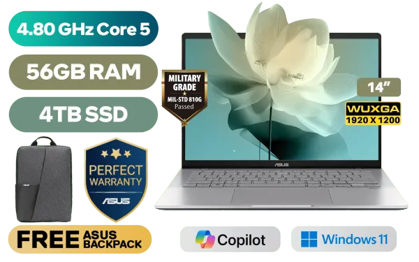 ASUS Vivobook S14 S3407VA Intel® Core™ 5-210H up to 4.80GHz Processor, 12MB Cache, 8x Cores, 12x Threads / 56GB DDR5 RAM / 4TB Ultra-Fast NVMe SSD / 14" WUXGA (1920 x 1200) Anti-Glare IPS-Level Display / Integrated Intel® Graphics / Windows 11 Home (64bit) / Realtek Wi-Fi 6 8852BE Wireless LAN / Bluetooth 5.3 / 1080p FHD IR camera With privacy shutter / 2x USB Type-A / 2x USB Type-C (Supports for Display / Power Delivery) / 1 x HDMI / 1x Microphone and Headphone Combo jack / White Backlit Chicklet Keyboard / 2x 2W Integrated Speakers / FREE Asus Backpack / ASUS Vivobook S14 S3407VA Core 5 Laptop DealASUS Vivobook S14 S3407VA Intel® Core™ 5-210H up to 4.80GHz Processor, 12MB Cache, 8x Cores, 12x Threads / 56GB DDR5 RAM / 4TB Ultra-Fast NVMe SSD / 14" WUXGA (1920 x 1200) Anti-Glare IPS-Level Display / Integrated Intel® Graphics / Windows 11 Home (64bit) / Realtek Wi-Fi 6 8852BE Wireless LAN / Bluetooth 5.3 / 1080p FHD IR camera With privacy shutter / 2x USB Type-A / 2x USB Type-C (Supports for Display / Power Delivery) / 1 x HDMI / 1x Microphone and Headphone Combo jack / White Backlit Chicklet Keyboard / 2x 2W Integrated Speakers / FREE Asus Backpack / ASUS Vivobook S14 S3407VA Core 5 Laptop Deal [S3407VA-I516512S1W/56GB/4TB] / 3 YEARS WARRANTY / [+] GET FREE Logitech M185 Wireless Mouse+ FREE DELIVERY !
