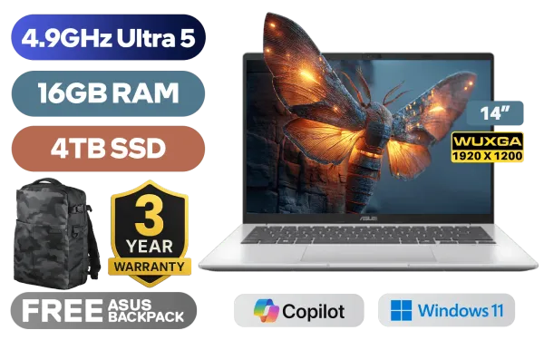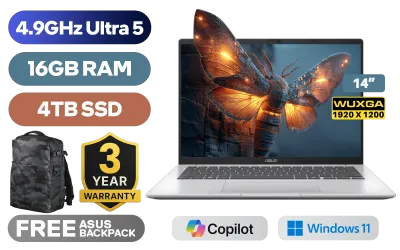 ASUS Vivobook S14 X1407CA Intel® Core™ Ultra 5-225H up to 4.9GHz Processor, 18MB Cache, 14x Cores, 14x Threads / 16GB DDR5 RAM / 4TB Ultra-Fast NVMe SSD / 14" WUXGA (1920x1200) Anti-Glare Display / Integrated Intel® Arc 130T Graphics / Windows 11 Home (64bit) / FHD IR Camera With Privacy Shutter / Realtek Wi-Fi 6 8851BE Wireless LAN / Bluetooth 5.2 / 2x USB Type-A / 2x USB Type-C (Supports DisplayPort / Power Delivery) / 1 x HDMI / 1x Microphone and Headphone Combo jack / White Backlit Keyboard / SonicMaster Audio / ASUS Vivobook S14 X1407CA Core Ultra 5 Laptop DealASUS Vivobook S14 X1407CA Intel® Core™ Ultra 5-225H up to 4.9GHz Processor, 18MB Cache, 14x Cores, 14x Threads / 16GB DDR5 RAM / 4TB Ultra-Fast NVMe SSD / 14" WUXGA (1920x1200) Anti-Glare Display / Integrated Intel® Arc 130T Graphics / Windows 11 Home (64bit) / FHD IR Camera With Privacy Shutter / Realtek Wi-Fi 6 8851BE Wireless LAN / Bluetooth 5.2 / 2x USB Type-A / 2x USB Type-C (Supports DisplayPort / Power Delivery) / 1 x HDMI / 1x Microphone and Headphone Combo jack / White Backlit Keyboard / SonicMaster Audio / ASUS Vivobook S14 X1407CA Core Ultra 5 Laptop Deal [X1407CA-U516512S0W/4TB] / [+] GET FREE EVETECH DASH Premium Gaming Backpack / 3 YEARS WARRANTY + FREE DELIVERY !