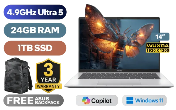 ASUS Vivobook S14 X1407CA Intel® Core™ Ultra 5-225H up to 4.9GHz Processor, 18MB Cache, 14x Cores, 14x Threads / 24GB DDR5 RAM / 1TB Ultra-Fast NVMe SSD / 14" WUXGA (1920x1200) Anti-Glare Display / Integrated Intel® Arc 130T Graphics / Windows 11 Home (64bit) / FHD IR Camera With Privacy Shutter / Realtek Wi-Fi 6 8851BE Wireless LAN / Bluetooth 5.2 / 2x USB Type-A / 2x USB Type-C (Supports DisplayPort / Power Delivery) / 1 x HDMI / 1x Microphone and Headphone Combo jack / White Backlit Keyboard / SonicMaster Audio / ASUS Vivobook S14 X1407CA Core Ultra 5 Laptop DealASUS Vivobook S14 X1407CA Intel® Core™ Ultra 5-225H up to 4.9GHz Processor, 18MB Cache, 14x Cores, 14x Threads / 24GB DDR5 RAM / 1TB Ultra-Fast NVMe SSD / 14" WUXGA (1920x1200) Anti-Glare Display / Integrated Intel® Arc 130T Graphics / Windows 11 Home (64bit) / FHD IR Camera With Privacy Shutter / Realtek Wi-Fi 6 8851BE Wireless LAN / Bluetooth 5.2 / 2x USB Type-A / 2x USB Type-C (Supports DisplayPort / Power Delivery) / 1 x HDMI / 1x Microphone and Headphone Combo jack / White Backlit Keyboard / SonicMaster Audio / ASUS Vivobook S14 X1407CA Core Ultra 5 Laptop Deal [X1407CA-U516512S0W/24GB/1TB] / [+] GET FREE EVETECH DASH Premium Gaming Backpack / 3 YEARS WARRANTY + FREE DELIVERY !