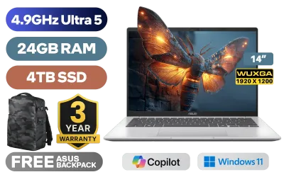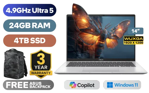 ASUS Vivobook S14 X1407CA Intel® Core™ Ultra 5-225H up to 4.9GHz Processor, 18MB Cache, 14x Cores, 14x Threads / 24GB DDR5 RAM / 4TB Ultra-Fast NVMe SSD / 14" WUXGA (1920x1200) Anti-Glare Display / Integrated Intel® Arc 130T Graphics / Windows 11 Home (64bit) / FHD IR Camera With Privacy Shutter / Realtek Wi-Fi 6 8851BE Wireless LAN / Bluetooth 5.2 / 2x USB Type-A / 2x USB Type-C (Supports DisplayPort / Power Delivery) / 1 x HDMI / 1x Microphone and Headphone Combo jack / White Backlit Keyboard / SonicMaster Audio / ASUS Vivobook S14 X1407CA Core Ultra 5 Laptop DealASUS Vivobook S14 X1407CA Intel® Core™ Ultra 5-225H up to 4.9GHz Processor, 18MB Cache, 14x Cores, 14x Threads / 24GB DDR5 RAM / 4TB Ultra-Fast NVMe SSD / 14" WUXGA (1920x1200) Anti-Glare Display / Integrated Intel® Arc 130T Graphics / Windows 11 Home (64bit) / FHD IR Camera With Privacy Shutter / Realtek Wi-Fi 6 8851BE Wireless LAN / Bluetooth 5.2 / 2x USB Type-A / 2x USB Type-C (Supports DisplayPort / Power Delivery) / 1 x HDMI / 1x Microphone and Headphone Combo jack / White Backlit Keyboard / SonicMaster Audio / ASUS Vivobook S14 X1407CA Core Ultra 5 Laptop Deal [X1407CA-U516512S0W/24GB/4TB] / [+] GET FREE EVETECH DASH Premium Gaming Backpack / 3 YEARS WARRANTY + FREE DELIVERY !
