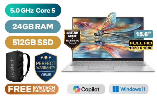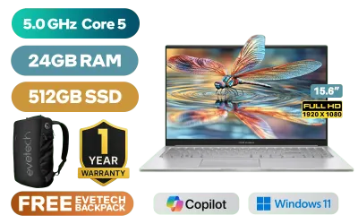 ASUS Vivobook X1504VA Intel Core 5-120U up to 5.0GHz Processor, 12MB Cache, 10x Cores, 12x Threads / 24GB DDR4 RAM / 512GB Ultra-Fast NVMe SSD / 15.6" FHD (1920 x 1080) Anti-glare Display / Integrated Intel Graphics / Windows 11 Home (64bit) / RealTek WiFi 6 8851BE Wireless LAN / Bluetooth 5.2 / 720p HD Camera with Privacy Shutter / 3x USB Type-A / 1x USB Type-C / 1x HDMI / 1x Microphone & Headphone Combo Jack / Built-in Speaker and Microphone SonicMaster Audio / 1 Year Warranty / ASUS Vivobook X1504VA Intel Core 5 Laptop DealASUS Vivobook X1504VA Intel Core 5-120U up to 5.0GHz Processor, 12MB Cache, 10x Cores, 12x Threads / 24GB DDR4 RAM / 512GB Ultra-Fast NVMe SSD / 15.6" FHD (1920 x 1080) Anti-glare Display / Integrated Intel Graphics / Windows 11 Home (64bit) / RealTek WiFi 6 8851BE Wireless LAN / Bluetooth 5.2 / 720p HD Camera with Privacy Shutter / 3x USB Type-A / 1x USB Type-C / 1x HDMI / 1x Microphone & Headphone Combo Jack / Built-in Speaker and Microphone SonicMaster Audio / 1 Year Warranty / ASUS Vivobook X1504VA Intel Core 5 Laptop Deal [X1504VAP-I58512S0W/24GB] / [+] GET FREE EVETECH NEO Premium Gaming Backpack+ FREE DELIVERY !