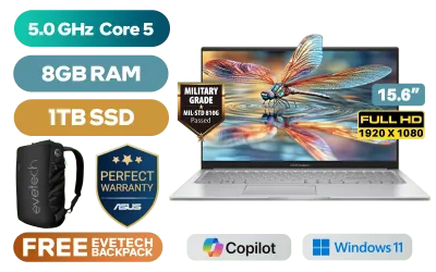 ASUS Vivobook X1504VA Intel Core 5-120U up to 5.0GHz Processor, 12MB Cache, 10x Cores, 12x Threads / 8GB DDR4 RAM / 1TB Ultra-Fast NVMe SSD / 15.6" FHD (1920 x 1080) Anti-glare Display / Integrated Intel Graphics / Windows 11 Home (64bit) / RealTek WiFi 6 8851BE Wireless LAN / Bluetooth 5.2 / 720p HD Camera with Privacy Shutter / 3x USB Type-A / 1x USB Type-C / 1x HDMI / 1x Microphone & Headphone Combo Jack / Built-in Speaker and Microphone SonicMaster Audio / 1 Year Warranty / ASUS Vivobook X1504VA Intel Core 5 Laptop DealASUS Vivobook X1504VA Intel Core 5-120U up to 5.0GHz Processor, 12MB Cache, 10x Cores, 12x Threads / 8GB DDR4 RAM / 1TB Ultra-Fast NVMe SSD / 15.6" FHD (1920 x 1080) Anti-glare Display / Integrated Intel Graphics / Windows 11 Home (64bit) / RealTek WiFi 6 8851BE Wireless LAN / Bluetooth 5.2 / 720p HD Camera with Privacy Shutter / 3x USB Type-A / 1x USB Type-C / 1x HDMI / 1x Microphone & Headphone Combo Jack / Built-in Speaker and Microphone SonicMaster Audio / 1 Year Warranty / ASUS Vivobook X1504VA Intel Core 5 Laptop Deal [X1504VAP-I58512S0W/1TB] / [+] GET FREE EVETECH NEO Premium Gaming Backpack+ FREE DELIVERY !