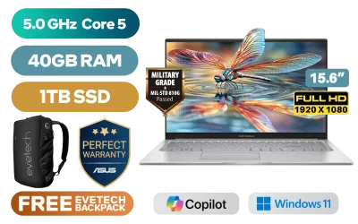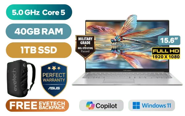 ASUS Vivobook X1504VA Intel Core 5-120U up to 5.0GHz Processor, 12MB Cache, 10x Cores, 12x Threads / 40GB DDR4 RAM / 1TB Ultra-Fast NVMe SSD / 15.6" FHD (1920 x 1080) Anti-glare Display / Integrated Intel Graphics / Windows 11 Home (64bit) / RealTek WiFi 6 8851BE Wireless LAN / Bluetooth 5.2 / 720p HD Camera with Privacy Shutter / 3x USB Type-A / 1x USB Type-C / 1x HDMI / 1x Microphone & Headphone Combo Jack / Built-in Speaker and Microphone SonicMaster Audio / 1 Year Warranty / ASUS Vivobook X1504VA Intel Core 5 Laptop DealASUS Vivobook X1504VA Intel Core 5-120U up to 5.0GHz Processor, 12MB Cache, 10x Cores, 12x Threads / 40GB DDR4 RAM / 1TB Ultra-Fast NVMe SSD / 15.6" FHD (1920 x 1080) Anti-glare Display / Integrated Intel Graphics / Windows 11 Home (64bit) / RealTek WiFi 6 8851BE Wireless LAN / Bluetooth 5.2 / 720p HD Camera with Privacy Shutter / 3x USB Type-A / 1x USB Type-C / 1x HDMI / 1x Microphone & Headphone Combo Jack / Built-in Speaker and Microphone SonicMaster Audio / 1 Year Warranty / ASUS Vivobook X1504VA Intel Core 5 Laptop Deal [X1504VAP-I58512S0W/40GB/1TB] / [+] GET FREE EVETECH NEO Premium Gaming Backpack+ FREE DELIVERY !