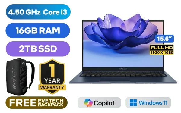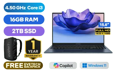 ASUS Vivobook X1504VA Intel Core i3-1315U up to 4.50GHz Processor, 10MB Cache, 6x Cores, 8x Threads / 16GB DDR4 RAM / 2TB Ultra-Fast NVMe SSD / 15.6" FHD (1920 x 1080) Anti-glare Display / Integrated Intel UHD Graphics / Windows 11 Home / MediaTek Wi-Fi 6E MT7902 Wireless LAN / Bluetooth 5.3 / 720p HD Camera with Privacy Shutter / 3x USB Type-A / 1x USB Type-C / 1x HDMI / 1x Microphone & Headphone Combo Jack / White Backlit Keyboard / Built-in Speaker and Microphone / 1 Year Warranty / ASUS Vivobook X1504VA Intel Core i3 Laptop DealASUS Vivobook X1504VA Intel Core i3-1315U up to 4.50GHz Processor, 10MB Cache, 6x Cores, 8x Threads / 16GB DDR4 RAM / 2TB Ultra-Fast NVMe SSD / 15.6" FHD (1920 x 1080) Anti-glare Display / Integrated Intel UHD Graphics / Windows 11 Home / MediaTek Wi-Fi 6E MT7902 Wireless LAN / Bluetooth 5.3 / 720p HD Camera with Privacy Shutter / 3x USB Type-A / 1x USB Type-C / 1x HDMI / 1x Microphone & Headphone Combo Jack / White Backlit Keyboard / Built-in Speaker and Microphone / 1 Year Warranty / ASUS Vivobook X1504VA Intel Core i3 Laptop Deal [X1504VA-I38512BL2W/16GB/2TB] / [+] GET FREE EVETECH NEO Premium Gaming Backpack+ FREE DELIVERY !