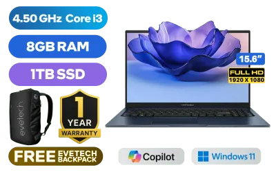 ASUS Vivobook X1504VA Intel Core i3-1315U up to 4.50GHz Processor, 10MB Cache, 6x Cores, 8x Threads / 8GB DDR4 RAM / 1TB Ultra-Fast NVMe SSD / 15.6" FHD (1920 x 1080) Anti-glare Display / Integrated Intel UHD Graphics / Windows 11 Home / MediaTek Wi-Fi 6E MT7902 Wireless LAN / Bluetooth 5.3 / 720p HD Camera with Privacy Shutter / 3x USB Type-A / 1x USB Type-C / 1x HDMI / 1x Microphone & Headphone Combo Jack / White Backlit Keyboard / Built-in Speaker and Microphone / 1 Year Warranty / ASUS Vivobook X1504VA Intel Core i3 Laptop DealASUS Vivobook X1504VA Intel Core i3-1315U up to 4.50GHz Processor, 10MB Cache, 6x Cores, 8x Threads / 8GB DDR4 RAM / 1TB Ultra-Fast NVMe SSD / 15.6" FHD (1920 x 1080) Anti-glare Display / Integrated Intel UHD Graphics / Windows 11 Home / MediaTek Wi-Fi 6E MT7902 Wireless LAN / Bluetooth 5.3 / 720p HD Camera with Privacy Shutter / 3x USB Type-A / 1x USB Type-C / 1x HDMI / 1x Microphone & Headphone Combo Jack / White Backlit Keyboard / Built-in Speaker and Microphone / 1 Year Warranty / ASUS Vivobook X1504VA Intel Core i3 Laptop Deal [X1504VA-I38512BL2W/1TB] / [+] GET FREE EVETECH NEO Premium Gaming Backpack+ FREE DELIVERY !