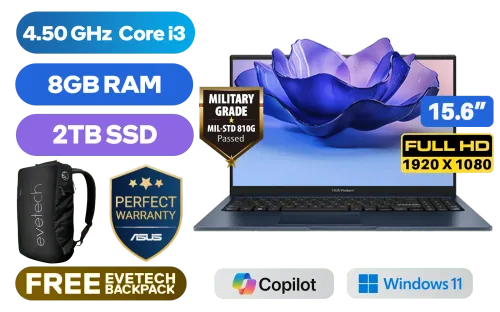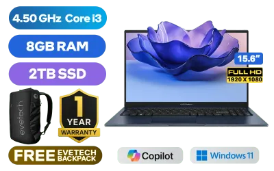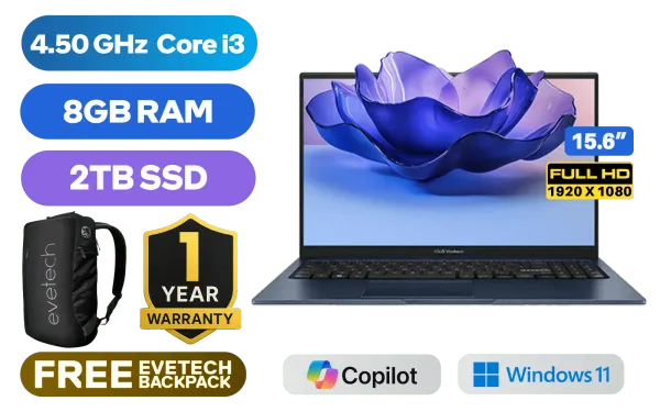 ASUS Vivobook X1504VA Intel Core i3-1315U up to 4.50GHz Processor, 10MB Cache, 6x Cores, 8x Threads / 8GB DDR4 RAM / 2TB Ultra-Fast NVMe SSD / 15.6" FHD (1920 x 1080) Anti-glare Display / Integrated Intel UHD Graphics / Windows 11 Home / MediaTek Wi-Fi 6E MT7902 Wireless LAN / Bluetooth 5.3 / 720p HD Camera with Privacy Shutter / 3x USB Type-A / 1x USB Type-C / 1x HDMI / 1x Microphone & Headphone Combo Jack / White Backlit Keyboard / Built-in Speaker and Microphone / 1 Year Warranty / ASUS Vivobook X1504VA Intel Core i3 Laptop DealASUS Vivobook X1504VA Intel Core i3-1315U up to 4.50GHz Processor, 10MB Cache, 6x Cores, 8x Threads / 8GB DDR4 RAM / 2TB Ultra-Fast NVMe SSD / 15.6" FHD (1920 x 1080) Anti-glare Display / Integrated Intel UHD Graphics / Windows 11 Home / MediaTek Wi-Fi 6E MT7902 Wireless LAN / Bluetooth 5.3 / 720p HD Camera with Privacy Shutter / 3x USB Type-A / 1x USB Type-C / 1x HDMI / 1x Microphone & Headphone Combo Jack / White Backlit Keyboard / Built-in Speaker and Microphone / 1 Year Warranty / ASUS Vivobook X1504VA Intel Core i3 Laptop Deal [X1504VA-I38512BL2W/2TB] / [+] GET FREE EVETECH NEO Premium Gaming Backpack+ FREE DELIVERY !