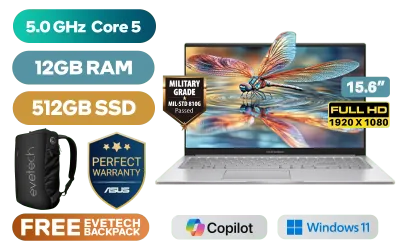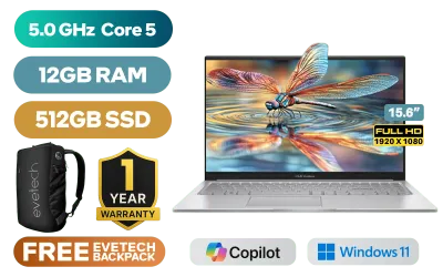 ASUS Vivobook X1504VA Intel Core 5-120U up to 5.0GHz Processor, 12MB Cache, 10x Cores, 12x Threads / 12GB DDR4 RAM / 512GB Ultra-Fast NVMe SSD / 15.6" FHD (1920 x 1080) Anti-glare Display / Integrated Intel Graphics / Windows 11 Home (64bit) / RealTek WiFi 6 8851BE Wireless LAN / Bluetooth 5.2 / 720p HD Camera with Privacy Shutter / 3x USB Type-A / 1x USB Type-C / 1x HDMI / 1x Microphone & Headphone Combo Jack / Built-in Speaker and Microphone SonicMaster Audio / 1 Year Warranty / ASUS Vivobook X1504VA Intel Core 5 Laptop DealASUS Vivobook X1504VA Intel Core 5-120U up to 5.0GHz Processor, 12MB Cache, 10x Cores, 12x Threads / 12GB DDR4 RAM / 512GB Ultra-Fast NVMe SSD / 15.6" FHD (1920 x 1080) Anti-glare Display / Integrated Intel Graphics / Windows 11 Home (64bit) / RealTek WiFi 6 8851BE Wireless LAN / Bluetooth 5.2 / 720p HD Camera with Privacy Shutter / 3x USB Type-A / 1x USB Type-C / 1x HDMI / 1x Microphone & Headphone Combo Jack / Built-in Speaker and Microphone SonicMaster Audio / 1 Year Warranty / ASUS Vivobook X1504VA Intel Core 5 Laptop Deal [X1504VAP-I58512S0W/12GB] / [+] GET FREE EVETECH NEO Premium Gaming Backpack+ FREE DELIVERY !