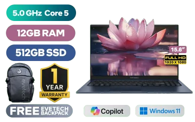 ASUS Vivobook X1504VAP Intel Core 5-120U up to 5.0GHz Processor, 12MB Cache, 10x Cores, 12x Threads / 12GB DDR4 RAM / 512GB Ultra-Fast NVMe SSD / 15.6" FHD (1920 x 1080) Anti-glare Display / Integrated Intel Graphics / Windows 11 Home / RealTek WiFi 6 8851BE Wireless LAN / Bluetooth 5.2 / 720p HD Camera with Privacy Shutter / 3x USB Type-A / 1x USB Type-C / 1x HDMI / 1x Microphone & Headphone Combo Jack / Built-in Speaker and Microphone with SonicMaster Audio / 1 Year Warranty / ASUS Vivobook X1504VAP Intel Core 5 Laptop DealASUS Vivobook X1504VAP Intel Core 5-120U up to 5.0GHz Processor, 12MB Cache, 10x Cores, 12x Threads / 12GB DDR4 RAM / 512GB Ultra-Fast NVMe SSD / 15.6" FHD (1920 x 1080) Anti-glare Display / Integrated Intel Graphics / Windows 11 Home / RealTek WiFi 6 8851BE Wireless LAN / Bluetooth 5.2 / 720p HD Camera with Privacy Shutter / 3x USB Type-A / 1x USB Type-C / 1x HDMI / 1x Microphone & Headphone Combo Jack / Built-in Speaker and Microphone with SonicMaster Audio / 1 Year Warranty / ASUS Vivobook X1504VAP Intel Core 5 Laptop Deal [X1504VAP-I58512Bl2W/12GB] / [+] GET FREE EVETECH FLUX Premium Gaming Backpack+ FREE DELIVERY !