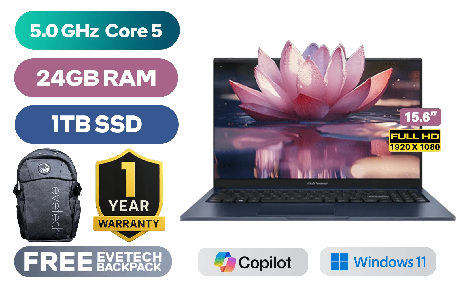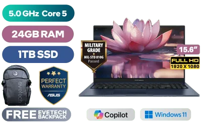 ASUS Vivobook X1504VAP Intel Core 5-120U up to 5.0GHz Processor, 12MB Cache, 10x Cores, 12x Threads / 24GB DDR4 RAM / 1TB Ultra-Fast NVMe SSD / 15.6" FHD (1920 x 1080) Anti-glare Display / Integrated Intel Graphics / Windows 11 Home / RealTek WiFi 6 8851BE Wireless LAN / Bluetooth 5.2 / 720p HD Camera with Privacy Shutter / 3x USB Type-A / 1x USB Type-C / 1x HDMI / 1x Microphone & Headphone Combo Jack / Built-in Speaker and Microphone with SonicMaster Audio / 1 Year Warranty / ASUS Vivobook X1504VAP Intel Core 5 Laptop DealASUS Vivobook X1504VAP Intel Core 5-120U up to 5.0GHz Processor, 12MB Cache, 10x Cores, 12x Threads / 24GB DDR4 RAM / 1TB Ultra-Fast NVMe SSD / 15.6" FHD (1920 x 1080) Anti-glare Display / Integrated Intel Graphics / Windows 11 Home / RealTek WiFi 6 8851BE Wireless LAN / Bluetooth 5.2 / 720p HD Camera with Privacy Shutter / 3x USB Type-A / 1x USB Type-C / 1x HDMI / 1x Microphone & Headphone Combo Jack / Built-in Speaker and Microphone with SonicMaster Audio / 1 Year Warranty / ASUS Vivobook X1504VAP Intel Core 5 Laptop Deal [X1504VAP-I58512Bl2W/24GB/1TB] / [+] GET FREE EVETECH FLUX Premium Gaming Backpack+ FREE DELIVERY !