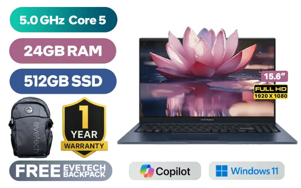 ASUS Vivobook X1504VAP Intel Core 5-120U up to 5.0GHz Processor, 12MB Cache, 10x Cores, 12x Threads / 24GB DDR4 RAM / 512GB Ultra-Fast NVMe SSD / 15.6" FHD (1920 x 1080) Anti-glare Display / Integrated Intel Graphics / Windows 11 Home / RealTek WiFi 6 8851BE Wireless LAN / Bluetooth 5.2 / 720p HD Camera with Privacy Shutter / 3x USB Type-A / 1x USB Type-C / 1x HDMI / 1x Microphone & Headphone Combo Jack / Built-in Speaker and Microphone with SonicMaster Audio / 1 Year Warranty / ASUS Vivobook X1504VAP Intel Core 5 Laptop DealASUS Vivobook X1504VAP Intel Core 5-120U up to 5.0GHz Processor, 12MB Cache, 10x Cores, 12x Threads / 24GB DDR4 RAM / 512GB Ultra-Fast NVMe SSD / 15.6" FHD (1920 x 1080) Anti-glare Display / Integrated Intel Graphics / Windows 11 Home / RealTek WiFi 6 8851BE Wireless LAN / Bluetooth 5.2 / 720p HD Camera with Privacy Shutter / 3x USB Type-A / 1x USB Type-C / 1x HDMI / 1x Microphone & Headphone Combo Jack / Built-in Speaker and Microphone with SonicMaster Audio / 1 Year Warranty / ASUS Vivobook X1504VAP Intel Core 5 Laptop Deal [X1504VAP-I58512Bl2W/24GB] / [+] GET FREE EVETECH FLUX Premium Gaming Backpack+ FREE DELIVERY !