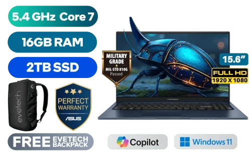 ASUS Vivobook X1504VAP Intel Core 7-150U up to 5.4GHz Processor, 12MB Cache, 10x Cores, 12x Threads / 16GB DDR5 RAM / 2TB Ultra-Fast NVMe SSD / 15.6" FHD (1920 x 1080) Anti-glare Display / Integrated Intel Graphics / Windows 11 Home (64bit) / RealTek WiFi 6 8851BE Wireless LAN / Bluetooth 5.2 / 720p HD Camera with Privacy Shutter / 3x USB Type-A / 1x USB Type-C / 1x HDMI / 1x Microphone & Headphone Combo Jack / White Backlit Keyboard / Built-in Speaker with SonicMaster Audio / ASUS Vivobook X1504VAP Intel Core 5 Laptop DealASUS Vivobook X1504VAP Intel Core 7-150U up to 5.4GHz Processor, 12MB Cache, 10x Cores, 12x Threads / 16GB DDR5 RAM / 2TB Ultra-Fast NVMe SSD / 15.6" FHD (1920 x 1080) Anti-glare Display / Integrated Intel Graphics / Windows 11 Home (64bit) / RealTek WiFi 6 8851BE Wireless LAN / Bluetooth 5.2 / 720p HD Camera with Privacy Shutter / 3x USB Type-A / 1x USB Type-C / 1x HDMI / 1x Microphone & Headphone Combo Jack / White Backlit Keyboard / Built-in Speaker with SonicMaster Audio / ASUS Vivobook X1504VAP Intel Core 5 Laptop Deal [X1504VAP-I78512BL4W/16GB/2TB] / 3 YEARS WARRANTY / [+] GET FREE EVETECH NEO Premium Gaming Backpack+ FREE DELIVERY !
