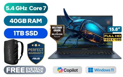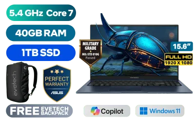 ASUS Vivobook X1504VAP Intel Core 7-150U up to 5.4GHz Processor, 12MB Cache, 10x Cores, 12x Threads / 40GB DDR5 RAM / 1TB Ultra-Fast NVMe SSD / 15.6" FHD (1920 x 1080) Anti-glare Display / Integrated Intel Graphics / Windows 11 Home (64bit) / RealTek WiFi 6 8851BE Wireless LAN / Bluetooth 5.2 / 720p HD Camera with Privacy Shutter / 3x USB Type-A / 1x USB Type-C / 1x HDMI / 1x Microphone & Headphone Combo Jack / White Backlit Keyboard / Built-in Speaker with SonicMaster Audio / ASUS Vivobook X1504VAP Intel Core 5 Laptop DealASUS Vivobook X1504VAP Intel Core 7-150U up to 5.4GHz Processor, 12MB Cache, 10x Cores, 12x Threads / 40GB DDR5 RAM / 1TB Ultra-Fast NVMe SSD / 15.6" FHD (1920 x 1080) Anti-glare Display / Integrated Intel Graphics / Windows 11 Home (64bit) / RealTek WiFi 6 8851BE Wireless LAN / Bluetooth 5.2 / 720p HD Camera with Privacy Shutter / 3x USB Type-A / 1x USB Type-C / 1x HDMI / 1x Microphone & Headphone Combo Jack / White Backlit Keyboard / Built-in Speaker with SonicMaster Audio / ASUS Vivobook X1504VAP Intel Core 5 Laptop Deal [X1504VAP-I78512BL4W/40GB/1TB] / 3 YEARS WARRANTY / [+] GET FREE EVETECH NEO Premium Gaming Backpack+ FREE DELIVERY !