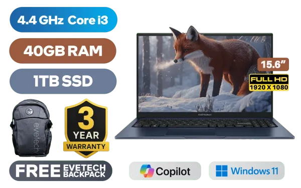 ASUS Vivobook X1504ZA 12th Gen Intel Core i3-1215U up to 4.4GHz Processor, 10MB Cache, 6x Cores, 8x Threads / 40GB DDR4 RAM / 1TB Ultra-Fast NVMe SSD / 15.6" FHD (1920x1080) Anti-glare Display / Integrated Intel UHD Graphics / Windows 11 Home (64bit) / MediaTek WiFi 6E MT7902 Wireless LAN / Bluetooth 5.3 / 720p HD Camera with Privacy Shutter / 3x USB Type-A / 1x USB Type-C / 1x HDMI / 1x Microphone & Headphone Combo Jack / SonicMaster Audio / ASUS Vivobook 15 X1504ZA Intel Core i3 Laptop DealASUS Vivobook X1504ZA 12th Gen Intel Core i3-1215U up to 4.4GHz Processor, 10MB Cache, 6x Cores, 8x Threads / 40GB DDR4 RAM / 1TB Ultra-Fast NVMe SSD / 15.6" FHD (1920x1080) Anti-glare Display / Integrated Intel UHD Graphics / Windows 11 Home (64bit) / MediaTek WiFi 6E MT7902 Wireless LAN / Bluetooth 5.3 / 720p HD Camera with Privacy Shutter / 3x USB Type-A / 1x USB Type-C / 1x HDMI / 1x Microphone & Headphone Combo Jack / SonicMaster Audio / ASUS Vivobook 15 X1504ZA Intel Core i3 Laptop Deal [X1504ZA-I38512BL1W/40GB/1TB] / [+] GET FREE EVETECH FLUX Premium Gaming Backpack / 3 YEARS WARRANTY + FREE DELIVERY !