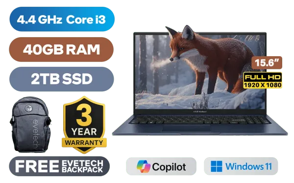 ASUS Vivobook X1504ZA 12th Gen Intel Core i3-1215U up to 4.4GHz Processor, 10MB Cache, 6x Cores, 8x Threads / 40GB DDR4 RAM / 2TB Ultra-Fast NVMe SSD / 15.6" FHD (1920x1080) Anti-glare Display / Integrated Intel UHD Graphics / Windows 11 Home (64bit) / MediaTek WiFi 6E MT7902 Wireless LAN / Bluetooth 5.3 / 720p HD Camera with Privacy Shutter / 3x USB Type-A / 1x USB Type-C / 1x HDMI / 1x Microphone & Headphone Combo Jack / SonicMaster Audio / ASUS Vivobook 15 X1504ZA Intel Core i3 Laptop DealASUS Vivobook X1504ZA 12th Gen Intel Core i3-1215U up to 4.4GHz Processor, 10MB Cache, 6x Cores, 8x Threads / 40GB DDR4 RAM / 2TB Ultra-Fast NVMe SSD / 15.6" FHD (1920x1080) Anti-glare Display / Integrated Intel UHD Graphics / Windows 11 Home (64bit) / MediaTek WiFi 6E MT7902 Wireless LAN / Bluetooth 5.3 / 720p HD Camera with Privacy Shutter / 3x USB Type-A / 1x USB Type-C / 1x HDMI / 1x Microphone & Headphone Combo Jack / SonicMaster Audio / ASUS Vivobook 15 X1504ZA Intel Core i3 Laptop Deal [X1504ZA-I38512BL1W/40GB/2TB] / [+] GET FREE EVETECH FLUX Premium Gaming Backpack / 3 YEARS WARRANTY + FREE DELIVERY !