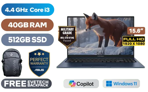 ASUS Vivobook X1504ZA 12th Gen Intel Core i3-1215U up to 4.4GHz Processor, 10MB Cache, 6x Cores, 8x Threads / 40GB DDR4 RAM / 512GB Ultra-Fast NVMe SSD / 15.6" FHD (1920x1080) Anti-glare Display / Integrated Intel UHD Graphics / Windows 11 Home (64bit) / MediaTek WiFi 6E MT7902 Wireless LAN / Bluetooth 5.3 / 720p HD Camera with Privacy Shutter / 3x USB Type-A / 1x USB Type-C / 1x HDMI / 1x Microphone & Headphone Combo Jack / SonicMaster Audio / ASUS Vivobook 15 X1504ZA Intel Core i3 Laptop DealASUS Vivobook X1504ZA 12th Gen Intel Core i3-1215U up to 4.4GHz Processor, 10MB Cache, 6x Cores, 8x Threads / 40GB DDR4 RAM / 512GB Ultra-Fast NVMe SSD / 15.6" FHD (1920x1080) Anti-glare Display / Integrated Intel UHD Graphics / Windows 11 Home (64bit) / MediaTek WiFi 6E MT7902 Wireless LAN / Bluetooth 5.3 / 720p HD Camera with Privacy Shutter / 3x USB Type-A / 1x USB Type-C / 1x HDMI / 1x Microphone & Headphone Combo Jack / SonicMaster Audio / ASUS Vivobook 15 X1504ZA Intel Core i3 Laptop Deal [X1504ZA-I38512BL1W/40GB] / [+] GET FREE EVETECH FLUX Premium Gaming Backpack / 3 YEARS WARRANTY + FREE DELIVERY !
