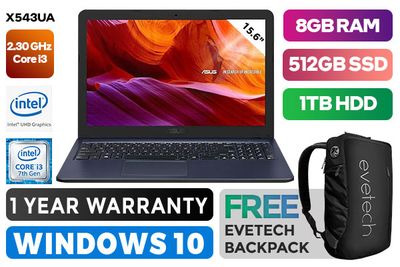 ASUS X543UA Intel 7th Gen Intel Core i3-7020U, 2.30GHz, 3MB Cache Processor, 4x Threads / 8GB DDR4 RAM / 512GB Ultra-Fast SSD + 1TB External HDD / 15.6" 16:9 HD 1366 x 768 Anti-Glare Display / Integrated Intel HD Graphics 620, DirectX 12 Support / No DVD Writer Included / 802.11b/g/n Wireless LAN / Bluetooth 4.2 / Micro-SD Card Reader / VGA Web Camera / Chiclet Keyboard / 1x HDMI / 3x USB Type-A / ASUS SonicMaster Audio Technology / 1x Audio Combo Jack / Windows 10 Home (64bit) / Ultra-light 1.9kg / 1 Year Warranty / ASUS X543UA 7th Gen Core i3 Laptop DealASUS X543UA Intel 7th Gen Intel Core i3-7020U, 2.30GHz, 3MB Cache Processor, 4x Threads / 8GB DDR4 RAM / 512GB Ultra-Fast SSD + 1TB External HDD / 15.6" 16:9 HD 1366 x 768 Anti-Glare Display / Integrated Intel HD Graphics 620, DirectX 12 Support / No DVD Writer Included / 802.11b/g/n Wireless LAN / Bluetooth 4.2 / Micro-SD Card Reader / VGA Web Camera / Chiclet Keyboard / 1x HDMI / 3x USB Type-A / ASUS SonicMaster Audio Technology / 1x Audio Combo Jack / Windows 10 Home (64bit) / Ultra-light 1.9kg / 1 Year Warranty / ASUS X543UA 7th Gen Core i3 Laptop Deal [X543UA-GQ2591T/8GB/512GB] / [+] GET FREE EVETECH NEO Premium Gaming Backpack+ FREE DELIVERY !