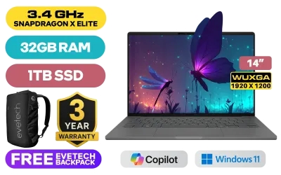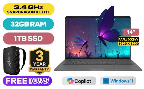 ASUS ZenBook A14 Qualcomm Snapdragon® X Elite X1E-78-100 Up to 3.4GHz Processor, 42MB Cache, 12x Cores, 12x Threads / 32GB LPDDR5X RAM / 1TB Ultra-Fast NVMe SSD / 14" WUXGA (1920 x 1200) OLED Display / Integrated Qualcomm® Adreno™ Graphics Card / Windows 11 Home (64bit) / FHD IR Web Camera / 802.11be Wi-Fi 7 Wireless LAN / Bluetooth 5.4 / 1x Type-A / 2x USB Type-C / 1x HDMI / 1x Headphone & Microphone Combo Jack / Smart Amp audio Technology / White Backlit Chiclet Keyboard / ASUS ZenBook A14 Snapdragon® X Elite Laptop DealASUS ZenBook A14 Qualcomm Snapdragon® X Elite X1E-78-100 Up to 3.4GHz Processor, 42MB Cache, 12x Cores, 12x Threads / 32GB LPDDR5X RAM / 1TB Ultra-Fast NVMe SSD / 14" WUXGA (1920 x 1200) OLED Display / Integrated Qualcomm® Adreno™ Graphics Card / Windows 11 Home (64bit) / FHD IR Web Camera / 802.11be Wi-Fi 7 Wireless LAN / Bluetooth 5.4 / 1x Type-A / 2x USB Type-C / 1x HDMI / 1x Headphone & Microphone Combo Jack / Smart Amp audio Technology / White Backlit Chiclet Keyboard / ASUS ZenBook A14 Snapdragon® X Elite Laptop Deal [UX3407RA-OQ3210G0W] / 3 YEARS WARRANTY / [+] GET FREE EVETECH NEO Premium Gaming Backpack+ FREE DELIVERY !