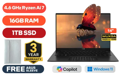 ASUS Zenbook UM3406GA AMD Ryzen™ AI 7 445 up to 4.6GHz, 14MB Cache, 6x Cores, 12x Threads / 16GB LPDDR5X RAM / 1TB Ultra-Fast NVMe SSD / 14" WUXGA (1920 x 1200) OLED Display / Integrated AMD Radeon™ Graphics / Windows 11 Home (64bit) / MediaTek MT7922 Wi-Fi 6E Wireless LAN / Bluetooth® 5.4 / FHD IR Webcam with Privacy Shutter / 1x USB Type-A / 2x USB Type-C (Supports DisplayPort / Power Delivery) / 1x HDMI / 1x Microphone & Headset Combo Jack / Backlit Chiclet Keyboard / Built-in Speakers with Smart Amp Technology / FREE Asus Sleeve / ASUS UM3406GA AMD Ryzen™ AI 7 445 Laptop DealASUS Zenbook UM3406GA AMD Ryzen™ AI 7 445 up to 4.6GHz, 14MB Cache, 6x Cores, 12x Threads / 16GB LPDDR5X RAM / 1TB Ultra-Fast NVMe SSD / 14" WUXGA (1920 x 1200) OLED Display / Integrated AMD Radeon™ Graphics / Windows 11 Home (64bit) / MediaTek MT7922 Wi-Fi 6E Wireless LAN / Bluetooth® 5.4 / FHD IR Webcam with Privacy Shutter / 1x USB Type-A / 2x USB Type-C (Supports DisplayPort / Power Delivery) / 1x HDMI / 1x Microphone & Headset Combo Jack / Backlit Chiclet Keyboard / Built-in Speakers with Smart Amp Technology / FREE Asus Sleeve / ASUS UM3406GA AMD Ryzen™ AI 7 445 Laptop Deal [UM3406GA-O71610B0W] / 3 YEARS WARRANTY + FREE DELIVERY !