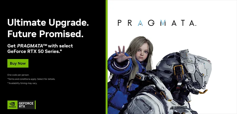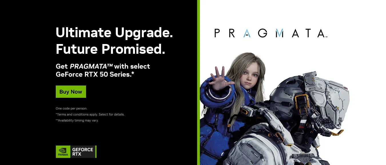 Limited time offer: receive PRAGMATA™ when you purchase a qualifying NVIDIA GeForce RTX™ 5090, 5080, 5070 Ti, or 5070 desktop GPU or system — or laptops equipped with GeForce RTX 5090, 5080, 5070 Ti, or 5070 Laptop GPUs. Get the game with your RTX 50 Series purchase today! 🎁💻