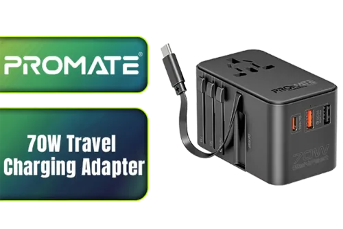 Promate 70W Travel Charging Adapter with Retractable USB C C
