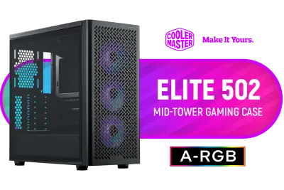 Cooler Master Elite 502 Mid-Tower Gaming Case - Black / ITX, Micro-ATX, ATX (Supporting Back-connector Motherboard), E-ATX Motherboard Support / Up to 7 Case Fans / Pre-installed 3x 120mm ARGB Fans / E502-KGNN-S00