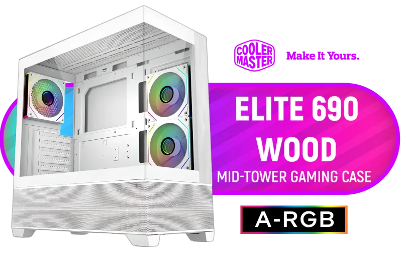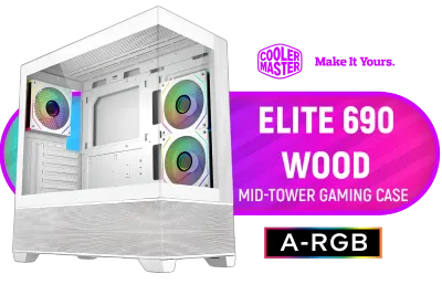 Cooler Master Elite 690 Wood Mid-Tower Gaming Case - White / ITX, Micro-ATX, ATX Motherboard Support / Up to 9 Case Fans / Pre-installed 3x 120mm ARGB Fans / E690-WHNN-S00