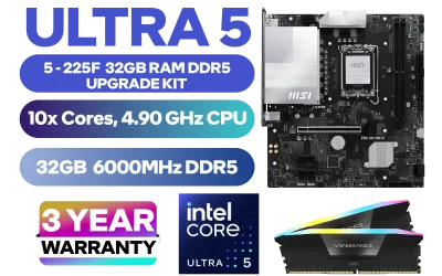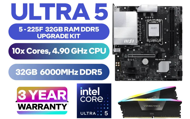 Intel Core Ultra 5 225F MSI PRO H810M-B 32GB RGB DDR5 6000MHz Upgrade Kit - MSI PRO H810M-B Intel Micro ATX Motherboard + Intel Core Ultra 5 225F Up to 4.90GHz CPU + Corsair Vengeance RGB DDR5 32GB (2x16GB) 6000MHz Desktop Memory / Discrete GPU Required - No Integrated Graphics