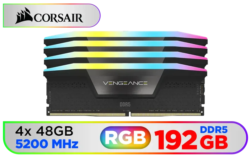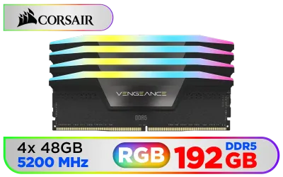 Corsair Vengeance RGB DDR5 192GB (4x48GB) DDR5 5200MHz CL38 Memory – Black / Ten-zone panoramic RGB lighting / Custom Intel XMP 3.0 profiles / Onboard voltage regulation / CMH192GX5M4B5200C38