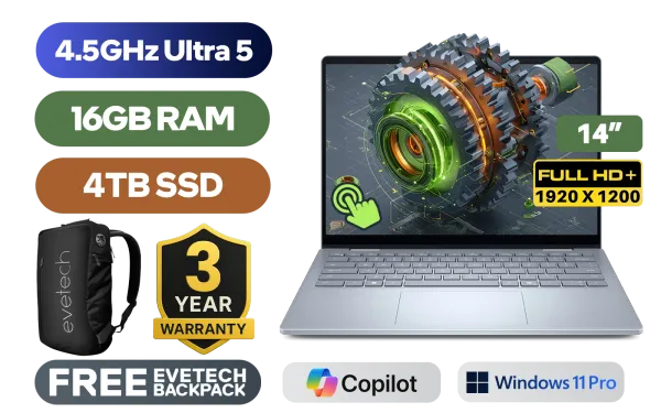Dell 14 Plus 2-in-1 DB04250 Intel Core Ultra 5 226V up to 4.5GHz Processor, 8MB Cache, 8x Cores, 8x Threads / 16GB LPDDR5x RAM / 4TB Ultra-Fast NVMe SSD / 14" FHD+ (1920 x 1200) Touchscreen Anti-Glare Display / Integrated Intel Arc 130V Graphics / <span style="font-size: 20px; color: #00BFFF; font-weight: bold;">Windows 11 Pro</span> / Intel WiFi 7 BE201 Wireless LAN / Bluetooth 5.4 / 1080P FHD Camera /1x USB Type-A / 2x USB Type-C ( Supports Thunderbolt 4 / DisplayPort / Power Delivery) / 1x HDMI / 1x Microphone & Headphone Combo Jack / Finger Print Reader / White Backlit Keyboard / 2x Stereo speakers with Waves MaxxAudio® Pro / Dell 14 Plus 2-in-1 DB04250 Intel Core Ultra 5 Laptop DealDell 14 Plus 2-in-1 DB04250 Intel Core Ultra 5 226V up to 4.5GHz Processor, 8MB Cache, 8x Cores, 8x Threads / 16GB LPDDR5x RAM / 4TB Ultra-Fast NVMe SSD / 14" FHD+ (1920 x 1200) Touchscreen Anti-Glare Display / Integrated Intel Arc 130V Graphics / Windows 11 Pro / Intel WiFi 7 BE201 Wireless LAN / Bluetooth 5.4 / 1080P FHD Camera /1x USB Type-A / 2x USB Type-C ( Supports Thunderbolt 4 / DisplayPort / Power Delivery) / 1x HDMI / 1x Microphone & Headphone Combo Jack / Finger Print Reader / White Backlit Keyboard / 2x Stereo speakers with Waves MaxxAudio® Pro / Dell 14 Plus 2-in-1 DB04250 Intel Core Ultra 5 Laptop Deal [DB04250_LNL_202/4TB] / [+] GET FREE EVETECH NEO Premium Gaming Backpack / 3 YEARS WARRANTY + FREE DELIVERY !