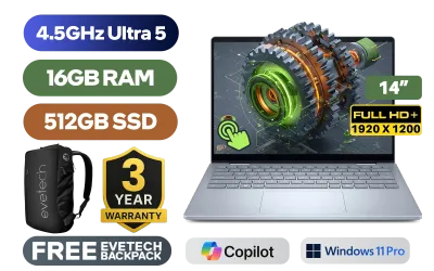 Dell 14 Plus 2-in-1 DB04250 Intel Core Ultra 5 226V up to 4.5GHz Processor, 8MB Cache, 8x Cores, 8x Threads / 16GB LPDDR5x RAM / 512GB Ultra-Fast NVMe SSD / 14" FHD+ (1920 x 1200) Touchscreen Anti-Glare Display / Integrated Intel Arc 130V Graphics / <span style="font-size: 20px; color: #00BFFF; font-weight: bold;">Windows 11 Pro</span> / Intel WiFi 7 BE201 Wireless LAN / Bluetooth 5.4 / 1080P FHD Camera /1x USB Type-A / 2x USB Type-C ( Supports Thunderbolt 4 / DisplayPort / Power Delivery) / 1x HDMI / 1x Microphone & Headphone Combo Jack / Finger Print Reader / White Backlit Keyboard / 2x Stereo speakers with Waves MaxxAudio® Pro / Dell 14 Plus 2-in-1 DB04250 Intel Core Ultra 5 Laptop DealDell 14 Plus 2-in-1 DB04250 Intel Core Ultra 5 226V up to 4.5GHz Processor, 8MB Cache, 8x Cores, 8x Threads / 16GB LPDDR5x RAM / 512GB Ultra-Fast NVMe SSD / 14" FHD+ (1920 x 1200) Touchscreen Anti-Glare Display / Integrated Intel Arc 130V Graphics / Windows 11 Pro / Intel WiFi 7 BE201 Wireless LAN / Bluetooth 5.4 / 1080P FHD Camera /1x USB Type-A / 2x USB Type-C ( Supports Thunderbolt 4 / DisplayPort / Power Delivery) / 1x HDMI / 1x Microphone & Headphone Combo Jack / Finger Print Reader / White Backlit Keyboard / 2x Stereo speakers with Waves MaxxAudio® Pro / Dell 14 Plus 2-in-1 DB04250 Intel Core Ultra 5 Laptop Deal [DB04250_LNL_202] / [+] GET FREE EVETECH NEO Premium Gaming Backpack / 3 YEARS WARRANTY + FREE DELIVERY !