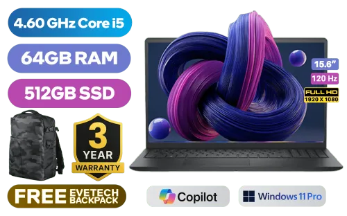 Dell 15 DC15250 Intel Core i5-1334U up to 4.60GHz Processor, 12MB cache, 10 cores, 12x Threads / 64GB DDR4 RAM / 512GB Ultra-Fast NVMe SSD / 15.6" FHD (1920 x 1080) 120Hz Anti-Glare IPS Display / Integrated Intel UHD Graphics / <span style="font-size: 20px; color: #00BFFF; font-weight: bold;">Windows 11 Pro (64bit)</span> / Realtek Wi-Fi 6 RTL8852BE Wireless LAN / Bluetooth 5.0 / 720p HD RGB camera / 2x USB Type-A / 1x USB Type-C / 1x HDMI / 1x Headphone & Microphone Audio Combo Jack / SD-card Reader / Dell 15 DC15250 Intel Core i5 Laptop Deal [NBDEDC15250RPLU004P]Dell 15 DC15250 Intel Core i5-1334U up to 4.60GHz Processor, 12MB cache, 10 cores, 12x Threads / 64GB DDR4 RAM / 512GB Ultra-Fast NVMe SSD / 15.6" FHD (1920 x 1080) 120Hz Anti-Glare IPS Display / Integrated Intel UHD Graphics / Windows 11 Pro (64bit) / Realtek Wi-Fi 6 RTL8852BE Wireless LAN / Bluetooth 5.0 / 720p HD RGB camera / 2x USB Type-A / 1x USB Type-C / 1x HDMI / 1x Headphone & Microphone Audio Combo Jack / SD-card Reader / Dell 15 DC15250 Intel Core i5 Laptop Deal [NBDEDC15250RPLU004P] [NBDEDC15250RPLU004P/64GB] / 3 YEARS WARRANTY / [+] GET FREE EVETECH DASH Premium Gaming Backpack+ FREE DELIVERY !