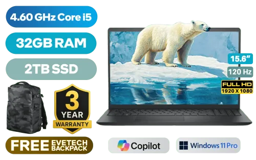 Dell 15 DC15250 Intel Core i5-1334U up to 4.60GHz Processor, 12MB cache, 10 cores, 12x Threads / 32GB DDR4 RAM / 2TB Ultra-Fast NVMe SSD / 15.6" FHD (1920 x 1080) 120Hz IPS-Level Display / Integrated Intel UHD Graphics / <span style="font-size: 20px; color: #00BFFF; font-weight: bold;">Windows 11 Pro (64bit)</span> / Realtek RTL8852BE WiFi 6 Wireless LAN / Bluetooth 5.4 / 720p HD camera / 2x USB Type-A / 1x USB Type-C / 1x HDMI / 1x Headphone & Microphone Combo Jack / 1x SD card Reader / Dell 15 DC15250 Core i5 Laptop DealDell 15 DC15250 Intel Core i5-1334U up to 4.60GHz Processor, 12MB cache, 10 cores, 12x Threads / 32GB DDR4 RAM / 2TB Ultra-Fast NVMe SSD / 15.6" FHD (1920 x 1080) 120Hz IPS-Level Display / Integrated Intel UHD Graphics / Windows 11 Pro (64bit) / Realtek RTL8852BE WiFi 6 Wireless LAN / Bluetooth 5.4 / 720p HD camera / 2x USB Type-A / 1x USB Type-C / 1x HDMI / 1x Headphone & Microphone Combo Jack / 1x SD card Reader / Dell 15 DC15250 Core i5 Laptop Deal [DC15250_RPLU_001_P/32GB/2TB] / [+] GET FREE EVETECH DASH Premium Gaming Backpack / 3 YEARS WARRANTY + FREE DELIVERY !