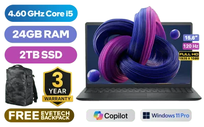 Dell 15 DC15250 Intel Core i5-1334U up to 4.60GHz Processor, 12MB cache, 10 cores, 12x Threads / 24GB DDR4 RAM / 2TB Ultra-Fast NVMe SSD / 15.6" FHD (1920 x 1080) 120Hz Anti-Glare IPS Display / Integrated Intel UHD Graphics / <span style="font-size: 20px; color: #00BFFF; font-weight: bold;">Windows 11 Pro (64bit)</span> / Realtek Wi-Fi 6 RTL8852BE Wireless LAN / Bluetooth 5.0 / 720p HD RGB camera / 2x USB Type-A / 1x USB Type-C / 1x HDMI / 1x Headphone & Microphone Audio Combo Jack / SD-card Reader / Dell 15 DC15250 Intel Core i5 Laptop Deal [NBDEDC15250RPLU004P]Dell 15 DC15250 Intel Core i5-1334U up to 4.60GHz Processor, 12MB cache, 10 cores, 12x Threads / 24GB DDR4 RAM / 2TB Ultra-Fast NVMe SSD / 15.6" FHD (1920 x 1080) 120Hz Anti-Glare IPS Display / Integrated Intel UHD Graphics / Windows 11 Pro (64bit) / Realtek Wi-Fi 6 RTL8852BE Wireless LAN / Bluetooth 5.0 / 720p HD RGB camera / 2x USB Type-A / 1x USB Type-C / 1x HDMI / 1x Headphone & Microphone Audio Combo Jack / SD-card Reader / Dell 15 DC15250 Intel Core i5 Laptop Deal [NBDEDC15250RPLU004P] [NBDEDC15250RPLU004P/24GB/2TB] / 3 YEARS WARRANTY / [+] GET FREE EVETECH DASH Premium Gaming Backpack+ FREE DELIVERY !