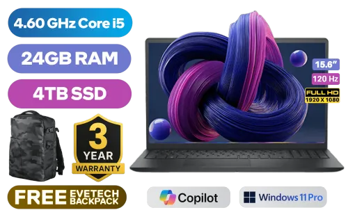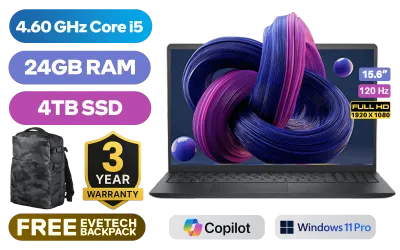 Dell 15 DC15250 Intel Core i5-1334U up to 4.60GHz Processor, 12MB cache, 10 cores, 12x Threads / 24GB DDR4 RAM / 4TB Ultra-Fast NVMe SSD / 15.6" FHD (1920 x 1080) 120Hz Anti-Glare IPS Display / Integrated Intel UHD Graphics / <span style="font-size: 20px; color: #00BFFF; font-weight: bold;">Windows 11 Pro (64bit)</span> / Realtek Wi-Fi 6 RTL8852BE Wireless LAN / Bluetooth 5.0 / 720p HD RGB camera / 2x USB Type-A / 1x USB Type-C / 1x HDMI / 1x Headphone & Microphone Audio Combo Jack / SD-card Reader / Dell 15 DC15250 Intel Core i5 Laptop Deal [NBDEDC15250RPLU004P]Dell 15 DC15250 Intel Core i5-1334U up to 4.60GHz Processor, 12MB cache, 10 cores, 12x Threads / 24GB DDR4 RAM / 4TB Ultra-Fast NVMe SSD / 15.6" FHD (1920 x 1080) 120Hz Anti-Glare IPS Display / Integrated Intel UHD Graphics / Windows 11 Pro (64bit) / Realtek Wi-Fi 6 RTL8852BE Wireless LAN / Bluetooth 5.0 / 720p HD RGB camera / 2x USB Type-A / 1x USB Type-C / 1x HDMI / 1x Headphone & Microphone Audio Combo Jack / SD-card Reader / Dell 15 DC15250 Intel Core i5 Laptop Deal [NBDEDC15250RPLU004P] [NBDEDC15250RPLU004P/24GB/4TB] / 3 YEARS WARRANTY / [+] GET FREE EVETECH DASH Premium Gaming Backpack+ FREE DELIVERY !