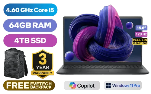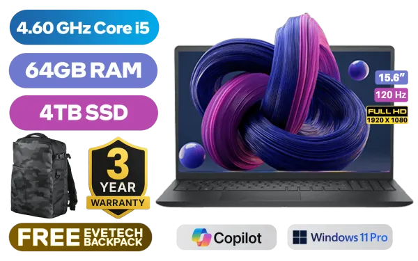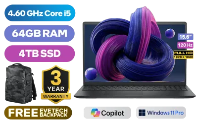 Dell 15 DC15250 Intel Core i5-1334U up to 4.60GHz Processor, 12MB cache, 10 cores, 12x Threads / 64GB DDR4 RAM / 4TB Ultra-Fast NVMe SSD / 15.6" FHD (1920 x 1080) 120Hz Anti-Glare IPS Display / Integrated Intel UHD Graphics / <span style="font-size: 20px; color: #00BFFF; font-weight: bold;">Windows 11 Pro (64bit)</span> / Realtek Wi-Fi 6 RTL8852BE Wireless LAN / Bluetooth 5.0 / 720p HD RGB camera / 2x USB Type-A / 1x USB Type-C / 1x HDMI / 1x Headphone & Microphone Audio Combo Jack / SD-card Reader / Dell 15 DC15250 Intel Core i5 Laptop Deal [NBDEDC15250RPLU004P]Dell 15 DC15250 Intel Core i5-1334U up to 4.60GHz Processor, 12MB cache, 10 cores, 12x Threads / 64GB DDR4 RAM / 4TB Ultra-Fast NVMe SSD / 15.6" FHD (1920 x 1080) 120Hz Anti-Glare IPS Display / Integrated Intel UHD Graphics / Windows 11 Pro (64bit) / Realtek Wi-Fi 6 RTL8852BE Wireless LAN / Bluetooth 5.0 / 720p HD RGB camera / 2x USB Type-A / 1x USB Type-C / 1x HDMI / 1x Headphone & Microphone Audio Combo Jack / SD-card Reader / Dell 15 DC15250 Intel Core i5 Laptop Deal [NBDEDC15250RPLU004P] [NBDEDC15250RPLU004P/64GB/4TB] / 3 YEARS WARRANTY / [+] GET FREE EVETECH DASH Premium Gaming Backpack+ FREE DELIVERY !