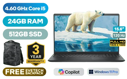 Dell 15 DC15250 Intel Core i5-1334U up to 4.60GHz Processor, 12MB cache, 10 cores, 12x Threads / 24GB DDR4 RAM / 512GB Ultra-Fast NVMe SSD / 15.6" FHD (1920 x 1080) 120Hz IPS-Level Display / Integrated Intel UHD Graphics / <span style="font-size: 20px; color: #00BFFF; font-weight: bold;">Windows 11 Pro (64bit)</span> / Realtek RTL8852BE WiFi 6 Wireless LAN / Bluetooth 5.4 / 720p HD camera / 2x USB Type-A / 1x USB Type-C / 1x HDMI / 1x Headphone & Microphone Combo Jack / 1x SD card Reader / Dell 15 DC15250 Core i5 Laptop DealDell 15 DC15250 Intel Core i5-1334U up to 4.60GHz Processor, 12MB cache, 10 cores, 12x Threads / 24GB DDR4 RAM / 512GB Ultra-Fast NVMe SSD / 15.6" FHD (1920 x 1080) 120Hz IPS-Level Display / Integrated Intel UHD Graphics / Windows 11 Pro (64bit) / Realtek RTL8852BE WiFi 6 Wireless LAN / Bluetooth 5.4 / 720p HD camera / 2x USB Type-A / 1x USB Type-C / 1x HDMI / 1x Headphone & Microphone Combo Jack / 1x SD card Reader / Dell 15 DC15250 Core i5 Laptop Deal [DC15250_RPLU_001_P/24GB] / [+] GET FREE EVETECH DASH Premium Gaming Backpack / 3 YEARS WARRANTY + FREE DELIVERY !
