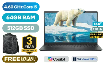 Dell 15 DC15250 Intel Core i5-1334U up to 4.60GHz Processor, 12MB cache, 10 cores, 12x Threads / 64GB DDR4 RAM / 512GB Ultra-Fast NVMe SSD / 15.6" FHD (1920 x 1080) 120Hz IPS-Level Display / Integrated Intel UHD Graphics / <span style="font-size: 20px; color: #00BFFF; font-weight: bold;">Windows 11 Pro (64bit)</span> / Realtek RTL8852BE WiFi 6 Wireless LAN / Bluetooth 5.4 / 720p HD camera / 2x USB Type-A / 1x USB Type-C / 1x HDMI / 1x Headphone & Microphone Combo Jack / 1x SD card Reader / Dell 15 DC15250 Core i5 Laptop DealDell 15 DC15250 Intel Core i5-1334U up to 4.60GHz Processor, 12MB cache, 10 cores, 12x Threads / 64GB DDR4 RAM / 512GB Ultra-Fast NVMe SSD / 15.6" FHD (1920 x 1080) 120Hz IPS-Level Display / Integrated Intel UHD Graphics / Windows 11 Pro (64bit) / Realtek RTL8852BE WiFi 6 Wireless LAN / Bluetooth 5.4 / 720p HD camera / 2x USB Type-A / 1x USB Type-C / 1x HDMI / 1x Headphone & Microphone Combo Jack / 1x SD card Reader / Dell 15 DC15250 Core i5 Laptop Deal [DC15250_RPLU_001_P/64GB] / [+] GET FREE EVETECH DASH Premium Gaming Backpack / 3 YEARS WARRANTY + FREE DELIVERY !