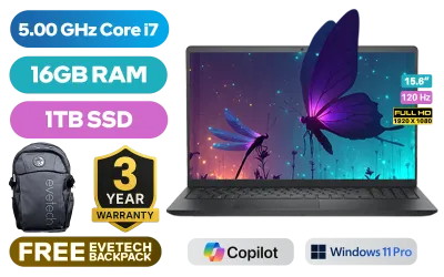 Dell 15 DC15250 Intel Core i7-1355U up to 5.0GHz Processor, 12MB cache, 10 cores, 12x Threads / 16GB DDR4 RAM / 1TB Ultra-Fast NVMe SSD / 15.6" FHD (1920 x 1080) 120Hz Anti-Glare IPS Display / Integrated Intel UHD Graphics / <span style="font-size: 20px; color: #00BFFF; font-weight: bold;">Windows 11 Pro (64bit)</span> / Realtek Wi-Fi 6 RTL8852BE Wireless LAN / Bluetooth 5.0 / 720p HD RGB camera / 2x USB Type-A / 1x USB Type-C / 1x HDMI / 1x Headphone & Microphone Audio Combo Jack / SD-card Reader / Dell 15 DC15250 Intel Core i7 Laptop Deal [NBDEDC15250RPLU006P]Dell 15 DC15250 Intel Core i7-1355U up to 5.0GHz Processor, 12MB cache, 10 cores, 12x Threads / 16GB DDR4 RAM / 1TB Ultra-Fast NVMe SSD / 15.6" FHD (1920 x 1080) 120Hz Anti-Glare IPS Display / Integrated Intel UHD Graphics / Windows 11 Pro (64bit) / Realtek Wi-Fi 6 RTL8852BE Wireless LAN / Bluetooth 5.0 / 720p HD RGB camera / 2x USB Type-A / 1x USB Type-C / 1x HDMI / 1x Headphone & Microphone Audio Combo Jack / SD-card Reader / Dell 15 DC15250 Intel Core i7 Laptop Deal [NBDEDC15250RPLU006P] [NBDEDC15250RPLU006P/1TB] / 3 YEARS WARRANTY / [+] GET FREE EVETECH FLUX Premium Gaming Backpack+ FREE DELIVERY !