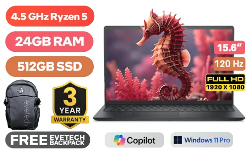 Dell 15 DC15255 1525-5658 Ryzen 5-7530U up to 4.5GHz Processor, 19MB cache, 6 cores, 12x Threads / 24GB DDR4 RAM / 512GB Ultra-Fast NVMe SSD / 15.6" FHD (1920 x 1080) 120Hz IPS-Level Display / Integrated AMD Radeon Graphics / <span style="font-size: 20px; color: #00BFFF; font-weight: bold;">Windows 11 Pro (64bit)</span> / Realtek WiFi 6 RTL8821CE Wireless LAN / Bluetooth 5.0 / 720p HD camera / 2x USB Type-A / 1x USB Type-C / 1x HDMI / 1x Headphone & Microphone Combo Jack / 1x SD card Reader / Dell 15 DC15255 Ryzen 5 Laptop DealDell 15 DC15255 1525-5658 Ryzen 5-7530U up to 4.5GHz Processor, 19MB cache, 6 cores, 12x Threads / 24GB DDR4 RAM / 512GB Ultra-Fast NVMe SSD / 15.6" FHD (1920 x 1080) 120Hz IPS-Level Display / Integrated AMD Radeon Graphics / Windows 11 Pro (64bit) / Realtek WiFi 6 RTL8821CE Wireless LAN / Bluetooth 5.0 / 720p HD camera / 2x USB Type-A / 1x USB Type-C / 1x HDMI / 1x Headphone & Microphone Combo Jack / 1x SD card Reader / Dell 15 DC15255 Ryzen 5 Laptop Deal [DC15255_BCLR_802/24GB] / 3 YEARS WARRANTY / [+] GET FREE EVETECH FLUX Premium Gaming Backpack+ FREE DELIVERY !