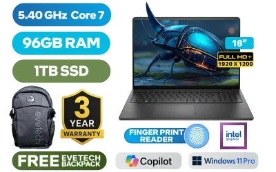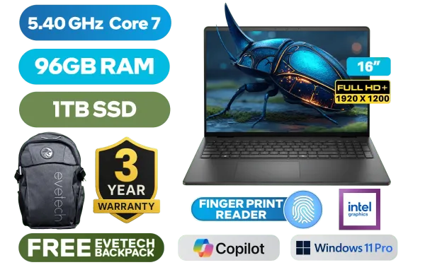 Dell 16 DC16250 1625-2852 Intel® Core™ 7-150U up to 5.40GHz Processor, 12MB Cache, 10x Cores, 12x Threads / 96GB DDR5 RAM / 1TB Ultra-Fast NVME SSD / 16" FHD+ (1920x1200) Anti-glare Display / Integrated Intel Graphics / <span style="font-size: 20px; color: #00BFFF; font-weight: bold;">Windows 11 Professional (64bit)</span> / Realtek RTL8852BE Wi-Fi 6 Wireless LAN / Bluetooth 5.2 / HD Web Camera / Fingerprint Reader / 2x USB Type-A / 1x USB Type-C (10Gbps) with Display Port 1.4 and Power Delivery / 1x HDMI 1.4 / 1x Audio and Headphone Combo Jack / Full Size White Backlit Keyboard / Dell 16 DC16250 Core 7 Laptop DealDell 16 DC16250 1625-2852 Intel® Core™ 7-150U up to 5.40GHz Processor, 12MB Cache, 10x Cores, 12x Threads / 96GB DDR5 RAM / 1TB Ultra-Fast NVME SSD / 16" FHD+ (1920x1200) Anti-glare Display / Integrated Intel Graphics / Windows 11 Professional (64bit) / Realtek RTL8852BE Wi-Fi 6 Wireless LAN / Bluetooth 5.2 / HD Web Camera / Fingerprint Reader / 2x USB Type-A / 1x USB Type-C (10Gbps) with Display Port 1.4 and Power Delivery / 1x HDMI 1.4 / 1x Audio and Headphone Combo Jack / Full Size White Backlit Keyboard / Dell 16 DC16250 Core 7 Laptop Deal [NBDEDC16250C716111PE/96GB] / 3 YEARS WARRANTY / [+] GET FREE EVETECH FLUX Premium Gaming Backpack+ FREE DELIVERY !