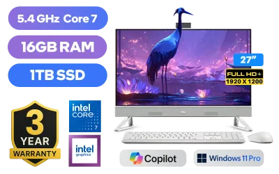 Dell 27 All-in-One EC27250 2725-6623 Intel® Core™ 7-150U up to 5.4GHz Processor, 12MB Cache, 10x Cores, 12x Threads / 16GB DDR5 RAM / 1TB Ultra-Fast NVMe SSD / 27" FHD (1920 x 1080) Anti-Glare Display / Integrated Intel® Graphics / <span style="font-size: 20px; color: #00BFFF; font-weight: bold;">Windows 11 Professional (64bit)</span> / Intel® Wi-Fi 6E AX211 Wireless LAN / Bluetooth 5.3 / 5MP Web Camera / 4x USB Type-A / 1x USB Type-C / 2x HDMI / 1x RJ-45 / 1x SD Card Reader / 1 x Headphone & Microphone Audio Combo Jack / Free Dell KM5221W Wireless Keyboard & Mouse / Dell EC27250 Intel® Core™ 7 All-in-One PC