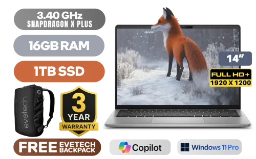 Dell Inspiron 14 Plus 5441 Qualcomm® Snapdragon X Plus, X1P-64-100 up to 3.40GHz Processor, 42MB Cache, 10x Cores / 16GB LPDDR5X RAM / 1TB Ultra-Fast NVMe SSD / 14" FHD+ (1920 x 1200) IPS Anti-Glare Display / Integrated Qualcomm Adreno Graphics / <span style="font-size: 20px; color: #00BFFF; font-weight: bold;">Windows 11 Professional (64bit)</span> / Qualcomm FastConnect 7800 Wi-Fi 7 / Bluetooth 5.4 / Qualcomm Spectra 695 ISP Camera / 1 x USB Type-A / 2 x USB Type-C / 1 xMircroSD Card Reader / 1 x Headphone & Microphone Audio Combo Jack / White Backlit keyboard / Dell Inspiron 14 5441 Snapdragon X Plus Laptop DealDell Inspiron 14 Plus 5441 Qualcomm® Snapdragon X Plus, X1P-64-100 up to 3.40GHz Processor, 42MB Cache, 10x Cores / 16GB LPDDR5X RAM / 1TB Ultra-Fast NVMe SSD / 14" FHD+ (1920 x 1200) IPS Anti-Glare Display / Integrated Qualcomm Adreno Graphics / Windows 11 Professional (64bit) / Qualcomm FastConnect 7800 Wi-Fi 7 / Bluetooth 5.4 / Qualcomm Spectra 695 ISP Camera / 1 x USB Type-A / 2 x USB Type-C / 1 xMircroSD Card Reader / 1 x Headphone & Microphone Audio Combo Jack / White Backlit keyboard / Dell Inspiron 14 5441 Snapdragon X Plus Laptop Deal [NBDEI5441XP10C1611PE] / 3 YEARS WARRANTY / [+] GET FREE EVETECH NEO Premium Gaming Backpack / [+] GET FREE Promate xWatch R20 Fitness Tracker Smartwatch - Black+ FREE DELIVERY !