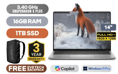 Dell Inspiron 14 Plus 5441 Qualcomm® Snapdragon X Plus, X1P-64-100 up to 3.40GHz Processor, 42MB Cache, 10x Cores / 16GB LPDDR5X RAM / 1TB Ultra-Fast NVMe SSD / 14" FHD+ (1920 x 1200) IPS Anti-Glare Display / Integrated Qualcomm Adreno Graphics / <span style="font-size: 20px; color: #00BFFF; font-weight: bold;">Windows 11 Professional (64bit)</span> / Qualcomm FastConnect 7800 Wi-Fi 7 / Bluetooth 5.4 / Qualcomm Spectra 695 ISP Camera / 1 x USB Type-A / 2 x USB Type-C / 1 xMircroSD Card Reader / 1 x Headphone & Microphone Audio Combo Jack / White Backlit keyboard / Dell Inspiron 14 5441 Snapdragon X Plus Laptop DealDell Inspiron 14 Plus 5441 Qualcomm® Snapdragon X Plus, X1P-64-100 up to 3.40GHz Processor, 42MB Cache, 10x Cores / 16GB LPDDR5X RAM / 1TB Ultra-Fast NVMe SSD / 14" FHD+ (1920 x 1200) IPS Anti-Glare Display / Integrated Qualcomm Adreno Graphics / Windows 11 Professional (64bit) / Qualcomm FastConnect 7800 Wi-Fi 7 / Bluetooth 5.4 / Qualcomm Spectra 695 ISP Camera / 1 x USB Type-A / 2 x USB Type-C / 1 xMircroSD Card Reader / 1 x Headphone & Microphone Audio Combo Jack / White Backlit keyboard / Dell Inspiron 14 5441 Snapdragon X Plus Laptop Deal [NBDEI5441XP10C1611PE] / 3 YEARS WARRANTY / [+] GET FREE EVETECH NEO Premium Gaming Backpack / [+] GET FREE Promate xWatch R20 Fitness Tracker Smartwatch - Black+ FREE DELIVERY !