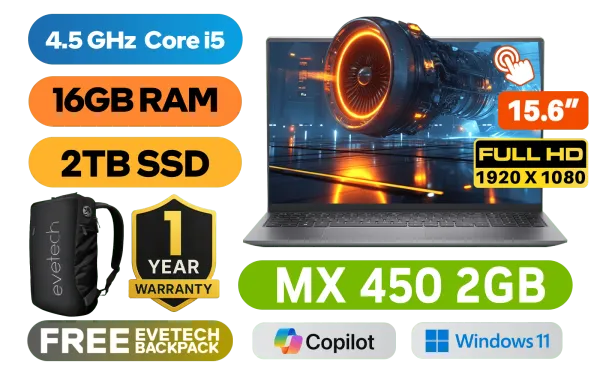 [TOUCHSCREEN] Dell Inspiron 15 5518 11th Gen Intel Tiger Lake Core i5-11320H up to 4.5GHz Processor, 8MB Cache, 4x Cores, 8x Threads / 16GB DDR4 RAM / 2TB Ultra-Fast NVMe SSD / 15.6" FHD 1920 x 1080 Anti-Glare Display With Touch Screen / NVIDIA Geforce MX450 2GB GDDR5 DirectX 12 Dedicated Graphics Card / Windows 11 Home (64bit) / No DVD Writer Included / WiFi 6 AX201 Wireless LAN / Bluetooth / HD Web Camera / 2x USB 3.2 Gen 1 Type-A / 1x USB 3.2 Type-C™ with DisplayPort™ and Power Delivery / 1x HDMI / 1x Audio In And Out Jack Combo / SD Card Reader / Fingerprint Reader / Single White Color Backlit Keyboard / 1 YEAR WARRANTY / Dell Inspiron 15 5518 11th Gen i5 Touchscreen Laptop Deal[TOUCHSCREEN] Dell Inspiron 15 5518 11th Gen Intel Tiger Lake Core i5-11320H up to 4.5GHz Processor, 8MB Cache, 4x Cores, 8x Threads / 16GB DDR4 RAM / 2TB Ultra-Fast NVMe SSD / 15.6" FHD 1920 x 1080 Anti-Glare Display With Touch Screen / NVIDIA Geforce MX450 2GB GDDR5 DirectX 12 Dedicated Graphics Card / Windows 11 Home (64bit) / No DVD Writer Included / WiFi 6 AX201 Wireless LAN / Bluetooth / HD Web Camera / 2x USB 3.2 Gen 1 Type-A / 1x USB 3.2 Type-C™ with DisplayPort™ and Power Delivery / 1x HDMI / 1x Audio In And Out Jack Combo / SD Card Reader / Fingerprint Reader / Single White Color Backlit Keyboard / 1 YEAR WARRANTY / Dell Inspiron 15 5518 11th Gen i5 Touchscreen Laptop Deal [CYBORGN515TGL2201_4101_GS/16GB/2TB] / [+] GET FREE EVETECH NEO Premium Gaming Backpack+ FREE DELIVERY !