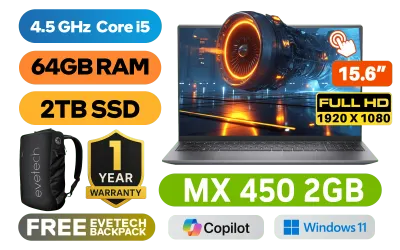 [TOUCHSCREEN] Dell Inspiron 15 5518 11th Gen Intel Tiger Lake Core i5-11320H up to 4.5GHz Processor, 8MB Cache, 4x Cores, 8x Threads / 64GB DDR4 RAM / 2TB Ultra-Fast NVMe SSD / 15.6" FHD 1920 x 1080 Anti-Glare Display With Touch Screen / NVIDIA Geforce MX450 2GB GDDR5 DirectX 12 Dedicated Graphics Card / Windows 11 Home (64bit) / No DVD Writer Included / WiFi 6 AX201 Wireless LAN / Bluetooth / HD Web Camera / 2x USB 3.2 Gen 1 Type-A / 1x USB 3.2 Type-C™ with DisplayPort™ and Power Delivery / 1x HDMI / 1x Audio In And Out Jack Combo / SD Card Reader / Fingerprint Reader / Single White Color Backlit Keyboard / 1 YEAR WARRANTY / Dell Inspiron 15 5518 11th Gen i5 Touchscreen Laptop Deal[TOUCHSCREEN] Dell Inspiron 15 5518 11th Gen Intel Tiger Lake Core i5-11320H up to 4.5GHz Processor, 8MB Cache, 4x Cores, 8x Threads / 64GB DDR4 RAM / 2TB Ultra-Fast NVMe SSD / 15.6" FHD 1920 x 1080 Anti-Glare Display With Touch Screen / NVIDIA Geforce MX450 2GB GDDR5 DirectX 12 Dedicated Graphics Card / Windows 11 Home (64bit) / No DVD Writer Included / WiFi 6 AX201 Wireless LAN / Bluetooth / HD Web Camera / 2x USB 3.2 Gen 1 Type-A / 1x USB 3.2 Type-C™ with DisplayPort™ and Power Delivery / 1x HDMI / 1x Audio In And Out Jack Combo / SD Card Reader / Fingerprint Reader / Single White Color Backlit Keyboard / 1 YEAR WARRANTY / Dell Inspiron 15 5518 11th Gen i5 Touchscreen Laptop Deal [CYBORGN515TGL2201_4101_GS/64GB/2TB] / [+] GET FREE EVETECH NEO Premium Gaming Backpack+ FREE DELIVERY !