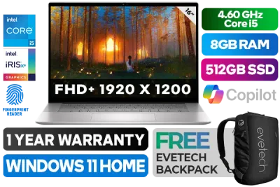 Dell Inspiron 16 5630 13th Gen Intel Core i5-1335U up to 4.60GHz Processor, 12MB Cache, 10x Cores, 12x Threads / 8GB LPDDR5 RAM / 512GB Ultra-Fast NVMe SSD / 16" FHD+ (1920 x 1200) Wide Viewing Angle Display / Integrated Intel Iris Xe Graphics, DirectX 12 Support / Windows 11 Home (64bit) / Dual Band WiFi 6E AX211 Wireless LAN / Bluetooth / FHD Web Camera with Dual Array Digital Microphone / 2x USB Type-A / 1x USB Type-C / 1x HDMI / 1 x Headphone & Microphone Audio Combo Jack / 1x SD Card Reader / Fingerprint Reader / White Backlit keyboard / 1 YEAR WARRANTY / Dell Inspiron 16 5630 13th Gen Core i5 laptopDell Inspiron 16 5630 13th Gen Intel Core i5-1335U up to 4.60GHz Processor, 12MB Cache, 10x Cores, 12x Threads / 8GB LPDDR5 RAM / 512GB Ultra-Fast NVMe SSD / 16" FHD+ (1920 x 1200) Wide Viewing Angle Display / Integrated Intel Iris Xe Graphics, DirectX 12 Support / Windows 11 Home (64bit) / Dual Band WiFi 6E AX211 Wireless LAN / Bluetooth / FHD Web Camera with Dual Array Digital Microphone / 2x USB Type-A / 1x USB Type-C / 1x HDMI / 1 x Headphone & Microphone Audio Combo Jack / 1x SD Card Reader / Fingerprint Reader / White Backlit keyboard / 1 YEAR WARRANTY / Dell Inspiron 16 5630 13th Gen Core i5 laptop [IS-5630-I5-1335U-8512GB-H-1YB] / [+] GET FREE EVETECH NEO Premium Gaming Backpack+ FREE DELIVERY !