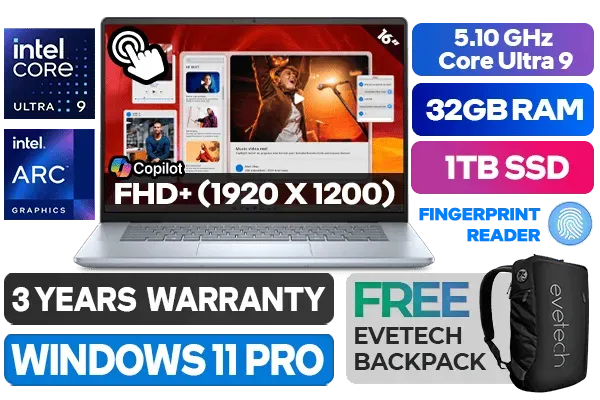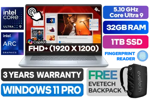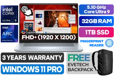 [TOUCHSCREEN] Dell Inspiron 16 Plus 7640 Intel® Core™ Ultra 9-185H up to 5.10GHz Processor, 24MB Cache, 16x Cores, 22x Threads / 32GB LPDDR5X RAM / 1TB Ultra-Fast NVMe SSD / 16" FHD+ (1920 x 1200) Anti-Glare WVA Display / Integrated Intel Arc Graphics / <span style="font-size: 20px; color: #00BFFF; font-weight: bold;">Windows 11 Professional (64bit)</span> / Intel WiFi 6E AX211 Wireless LAN / Bluetooth® / FHD Web Camera with Dual Array Digital Microphone / 2x USB Type-A / 1x USB Type-C Thunderbolt 4 / 1x HDMI 1.4b / 1 x Headphone & Microphone Audio Combo Jack / 1x SD Card Reader / Fingerprint Reader / White Backlit keyboard / 3 years Warranty / Dell Inspiron 16 Plus 7640 Intel® Core™ Ultra 9 laptop Deal[TOUCHSCREEN] Dell Inspiron 16 Plus 7640 Intel® Core™ Ultra 9-185H up to 5.10GHz Processor, 24MB Cache, 16x Cores, 22x Threads / 32GB LPDDR5X RAM / 1TB Ultra-Fast NVMe SSD / 16" FHD+ (1920 x 1200) Anti-Glare WVA Display / Integrated Intel Arc Graphics / Windows 11 Professional (64bit) / Intel WiFi 6E AX211 Wireless LAN / Bluetooth® / FHD Web Camera with Dual Array Digital Microphone / 2x USB Type-A / 1x USB Type-C Thunderbolt 4 / 1x HDMI 1.4b / 1 x Headphone & Microphone Audio Combo Jack / 1x SD Card Reader / Fingerprint Reader / White Backlit keyboard / 3 years Warranty / Dell Inspiron 16 Plus 7640 Intel® Core™ Ultra 9 laptop Deal [NBDE7640FU9321W11PE] / 3 YEARS WARRANTY / [+] GET FREE EVETECH NEO Premium Gaming Backpack+ FREE DELIVERY !