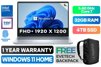 Dell Inspiron 5440 Intel Core 7-150U up to 5.40GHz Processor, 12MB Cache, 10x Cores, 12x Threads / 32GB DDR5 RAM / 4TB Ultra-Fast NVMe SSD / 14" FHD+ 1920x1200 Anti-glare IPS Display / Integrated Intel Graphics / Windows 11 Home (64bit) / No DVD Writer Included / Realtek RTL8852BE Wi-Fi 6 Wireless LAN / Finger Print Reader / Bluetooth / FHD-RGB Camera, Dual-array microphones / 2x USB 3.2 Type-A / 1x USB Type-C With Thunderbolt 4 ports with DisplayPort / 1x HDMI 1.4 / 1x Audio In And Out Combo Jack / Single White Color Backlit Keyboard / 1 Year Warranty / Dell Inspiron 5440 Intel Core 7 Laptop DealDell Inspiron 5440 Intel Core 7-150U up to 5.40GHz Processor, 12MB Cache, 10x Cores, 12x Threads / 32GB DDR5 RAM / 4TB Ultra-Fast NVMe SSD / 14" FHD+ 1920x1200 Anti-glare IPS Display / Integrated Intel Graphics / Windows 11 Home (64bit) / No DVD Writer Included / Realtek RTL8852BE Wi-Fi 6 Wireless LAN / Finger Print Reader / Bluetooth / FHD-RGB Camera, Dual-array microphones / 2x USB 3.2 Type-A / 1x USB Type-C With Thunderbolt 4 ports with DisplayPort / 1x HDMI 1.4 / 1x Audio In And Out Combo Jack / Single White Color Backlit Keyboard / 1 Year Warranty / Dell Inspiron 5440 Intel Core 7 Laptop Deal [NBDEI5440C7161W11HE/32GB/4TB] / [+] GET FREE EVETECH NEO Premium Gaming Backpack+ FREE DELIVERY !