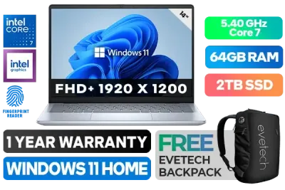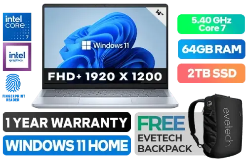 Dell Inspiron 5440 Intel Core 7-150U up to 5.40GHz Processor, 12MB Cache, 10x Cores, 12x Threads / 64GB DDR5 RAM / 2TB Ultra-Fast NVMe SSD / 14" FHD+ 1920x1200 Anti-glare IPS Display / Integrated Intel Graphics / Windows 11 Home (64bit) / No DVD Writer Included / Realtek RTL8852BE Wi-Fi 6 Wireless LAN / Finger Print Reader / Bluetooth / FHD-RGB Camera, Dual-array microphones / 2x USB 3.2 Type-A / 1x USB Type-C With Thunderbolt 4 ports with DisplayPort / 1x HDMI 1.4 / 1x Audio In And Out Combo Jack / Single White Color Backlit Keyboard / 1 Year Warranty / Dell Inspiron 5440 Intel Core 7 Laptop DealDell Inspiron 5440 Intel Core 7-150U up to 5.40GHz Processor, 12MB Cache, 10x Cores, 12x Threads / 64GB DDR5 RAM / 2TB Ultra-Fast NVMe SSD / 14" FHD+ 1920x1200 Anti-glare IPS Display / Integrated Intel Graphics / Windows 11 Home (64bit) / No DVD Writer Included / Realtek RTL8852BE Wi-Fi 6 Wireless LAN / Finger Print Reader / Bluetooth / FHD-RGB Camera, Dual-array microphones / 2x USB 3.2 Type-A / 1x USB Type-C With Thunderbolt 4 ports with DisplayPort / 1x HDMI 1.4 / 1x Audio In And Out Combo Jack / Single White Color Backlit Keyboard / 1 Year Warranty / Dell Inspiron 5440 Intel Core 7 Laptop Deal [NBDEI5440C7161W11HE/64GB/2TB] / [+] GET FREE EVETECH NEO Premium Gaming Backpack+ FREE DELIVERY !